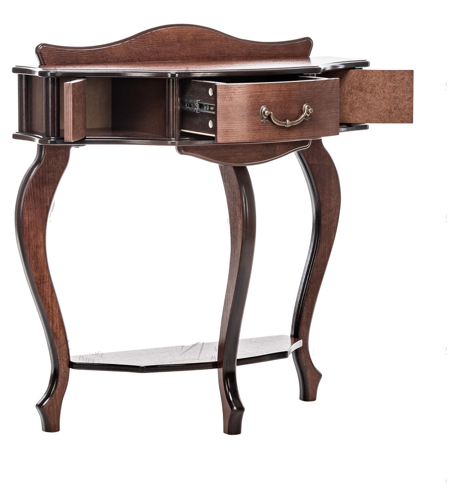 Имеет большой выдвижной ящик с ручкой. Боковые створки без ящиков.