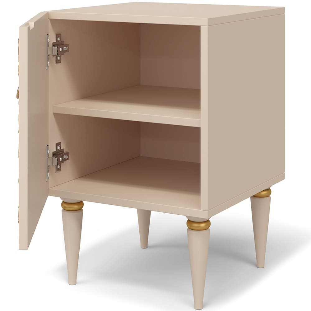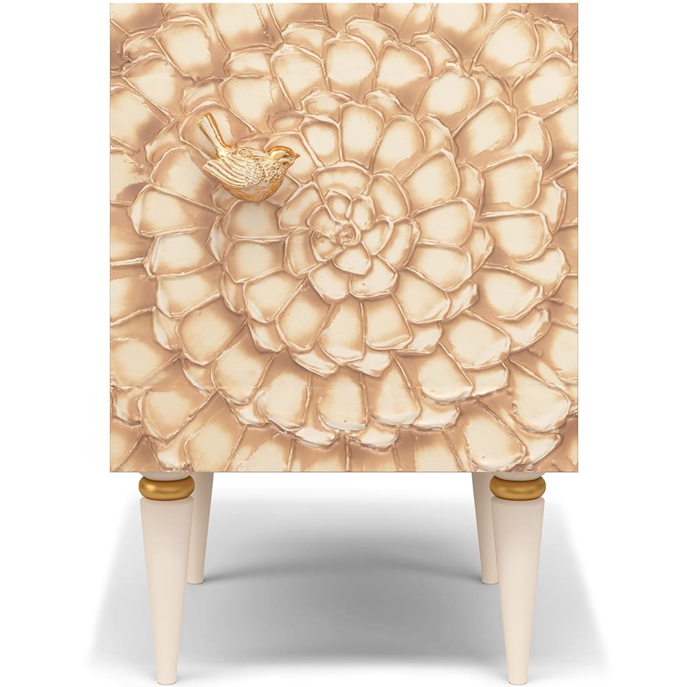 Прикроватная тумба с закрытой полкой на конических ножках с элементами декора в виде птички на цветке с мотивами старины.